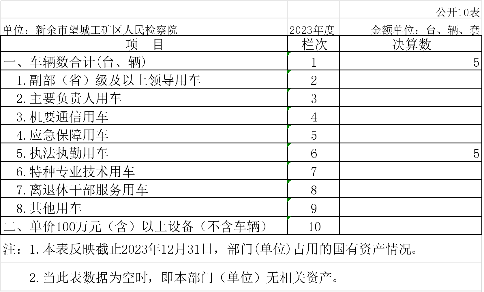 截止2023年12月31日,本单位共有车辆5辆(台),其中:副部(省)级及以上领导用车0辆、主要负责人用车0辆、机要通信用车0辆、应急保障用车0辆、执法执勤用车5辆、特种专业技术用车0辆、离退休干部服务用车5辆、其他用车0辆,其他用车无。本单位单价100万元(含)以上设备(不含车辆)0台(套)。