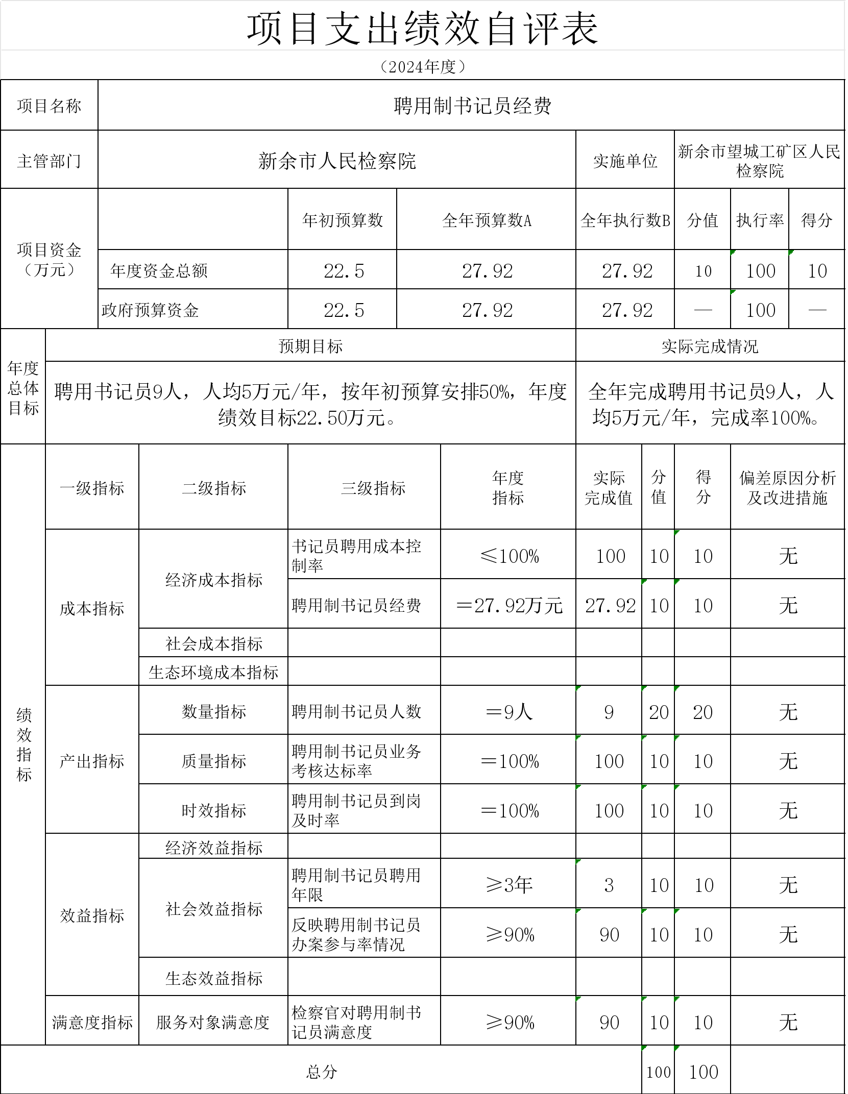 本单位“ 聘用制书记员经费 ”项目绩效自评结果如下: